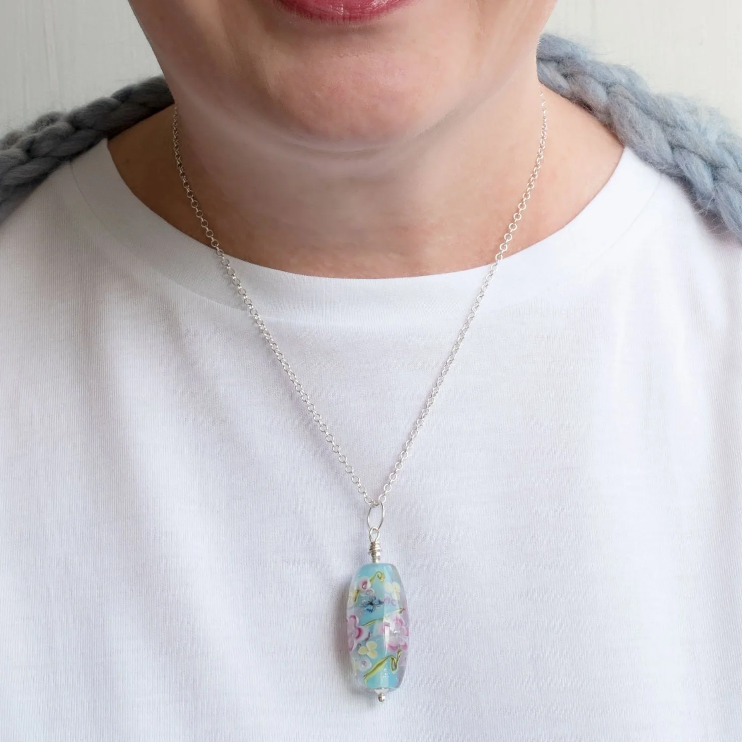 This stunning, turquoise lampwork floral and butterfly necklace is called Summer because of it's lovely bright summery colours. This gorgeous, one of a kind floral pendant, will add a welcome splash of colour to the greyest of days.